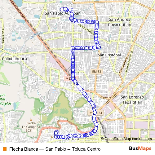 The first stop of the Flecha Blanca bus route is Calle 18 de Marzo y Calle Tlalnepantla and the last stop is Calle Independencia. Flecha Blanca (San Pablo → Toluca Centro) is operational during todos los días.