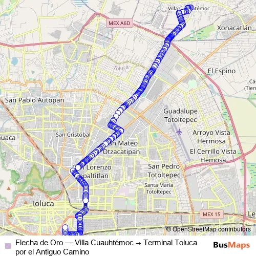 Click here to view the nearest Flecha de Oro - Villa Cuauhtémoc → Terminal Toluca por el Antiguo Camino bus stop.