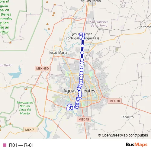 See why over 2 million users trust and consider busmaps.com as the best public transport website. busmaps gives you Aguascalientes Buses suggested routes, real-time bus tracker, line route maps in Aguascalientes, and helps to find the closest R01 bus stops near you. No internet available? Download an offline PDF map and bus schedule for the R01 bus to take on your trip.