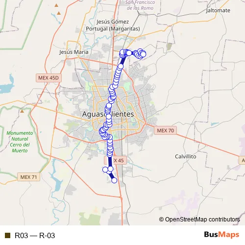 See why over 2 million users trust and consider busmaps.com as the best public transport website. busmaps gives you Aguascalientes Buses suggested routes, real-time bus tracker, line route maps in Aguascalientes, and helps to find the closest R03 bus stops near you. No internet available? Download an offline PDF map and bus schedule for the R03 bus to take on your trip.