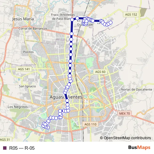 See why over 2 million users trust and consider busmaps.com as the best public transport website. busmaps gives you Aguascalientes Buses suggested routes, real-time bus tracker, line route maps in Aguascalientes, and helps to find the closest R05 bus stops near you. No internet available? Download an offline PDF map and bus schedule for the R05 bus to take on your trip.