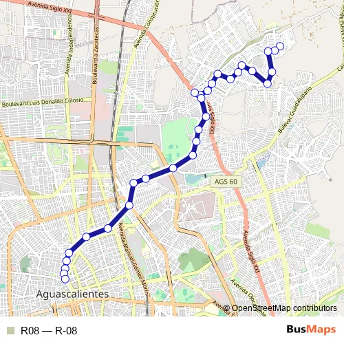 See why over 2 million users trust and consider busmaps.com as the best public transport website. busmaps gives you Aguascalientes Buses suggested routes, real-time bus tracker, line route maps in Aguascalientes, and helps to find the closest R08 bus stops near you. No internet available? Download an offline PDF map and bus schedule for the R08 bus to take on your trip.