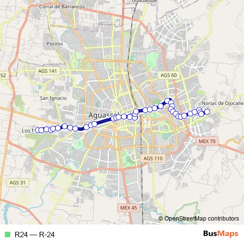 See why over 2 million users trust and consider busmaps.com as the best public transport website. busmaps gives you Aguascalientes Buses suggested routes, real-time bus tracker, line route maps in Aguascalientes, and helps to find the closest R24 bus stops near you. No internet available? Download an offline PDF map and bus schedule for the R24 bus to take on your trip.