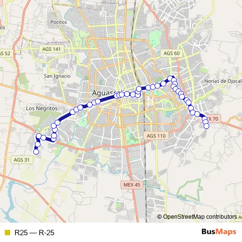 See why over 2 million users trust and consider busmaps.com as the best public transport website. busmaps gives you Aguascalientes Buses suggested routes, real-time bus tracker, line route maps in Aguascalientes, and helps to find the closest R25 bus stops near you. No internet available? Download an offline PDF map and bus schedule for the R25 bus to take on your trip.