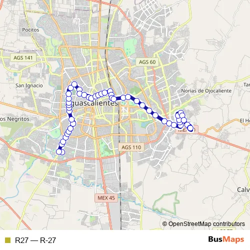 See why over 2 million users trust and consider busmaps.com as the best public transport website. busmaps gives you Aguascalientes Buses suggested routes, real-time bus tracker, line route maps in Aguascalientes, and helps to find the closest R27 bus stops near you. No internet available? Download an offline PDF map and bus schedule for the R27 bus to take on your trip.