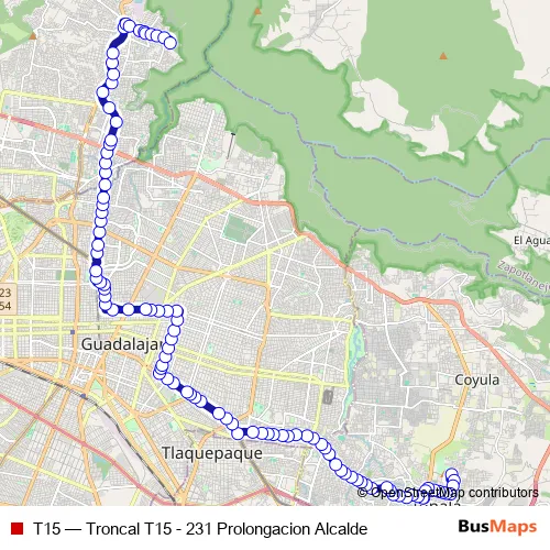 The first stop of the T15 bus route is Calle Ramón Corona and the last stop is Ramón López Velarde. T15 (Troncal T15 - 231 Prolongacion Alcalde) is operational during todos los días.