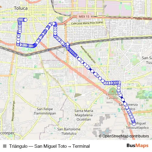 See why over 2 million users trust and consider busmaps.com as the best public transport website. busmaps gives you Toluca Buses suggested routes, real-time bus tracker, line route maps in Toluca, and helps to find the closest Triángulo bus stops near you. No internet available? Download an offline PDF map and bus schedule for the Triángulo bus to take on your trip.