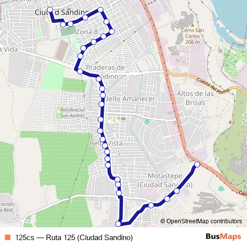 See why over 2 million users trust and consider busmaps.com as the best public transport website. busmaps gives you Ciudad Sandino Buses suggested routes, real-time bus tracker, line route maps in Ciudad Sandino, and helps to find the closest 125cs bus stops near you. No internet available? Download an offline PDF map and bus schedule for the 125cs bus to take on your trip.