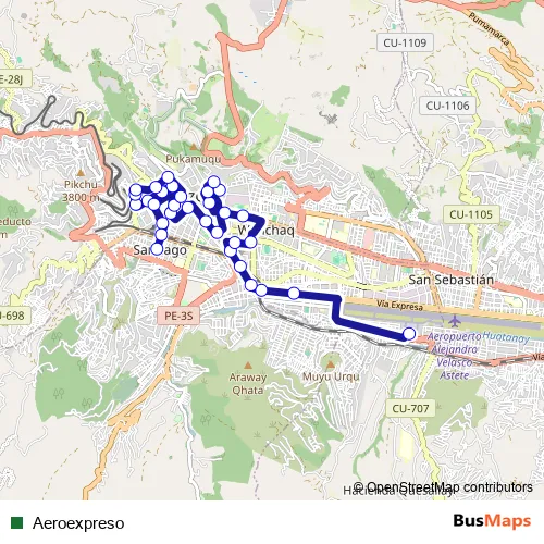 The first stop of the Aeroexpreso bus route is Aeropuerto del Cusco (Aeroexpreso - Cusco Airport Shuttle) and the last stop is Plaza de Santiago. Aeroexpreso is operational during todos los días.