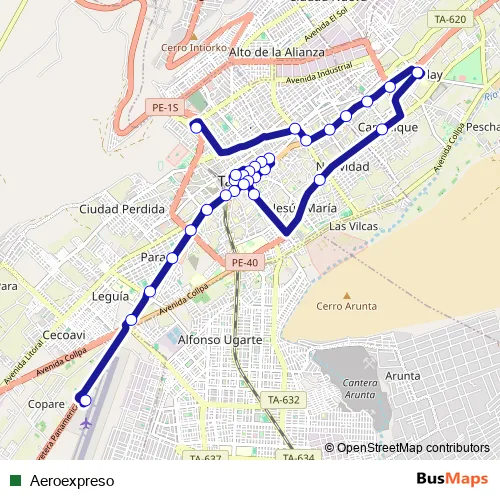 The first stop of the Aeroexpreso bus route is Terminal Terrestre Nacional Manuel A. Odría and the last stop is Aeropuerto de Tacna (Aeroexpreso - Tacna Airport Shuttle). Aeroexpreso is operational during todos los días.
