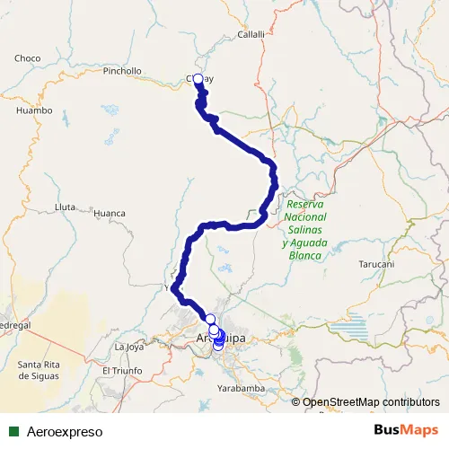 The first stop of the Aeroexpreso bus route is Terminal Terrestre de Arequipa and the last stop is Terminal Terrestre Bernardo Ocsa Yajo. Aeroexpreso is operational during todos los días.