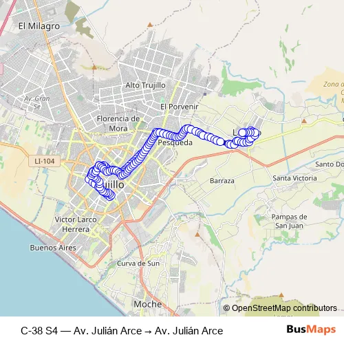 See why over 2 million users trust and consider busmaps.com as the best public transport website. busmaps gives you Trujillo Buses suggested routes, real-time bus tracker, line route maps in Trujillo, and helps to find the closest C-38 S4 bus stops near you. No internet available? Download an offline PDF map and bus schedule for the C-38 S4 bus to take on your trip.