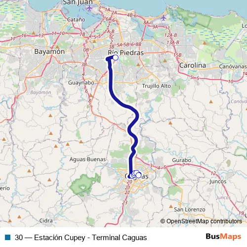 The first stop of the 30 bus route is Terminal Cupey and the last stop is Terminal Transporte Publico de Caguas. 30 (Estación Cupey - Terminal Caguas) is operational during todos los días.
