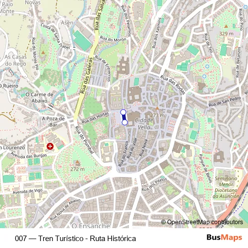 The first stop of the 007 bus route is Praza DO Obradoiro and the last stop is Praza DO Obradoiro I. 007 (Tren Turístico - Ruta Histórica) is operational during todos los días.