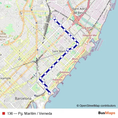 The first stop of the 136 bus route is Rambla Prim-Santander and the last stop is Pg Marítim. 136 (Pg. Marítim / Verneda) is operational during todos los días.