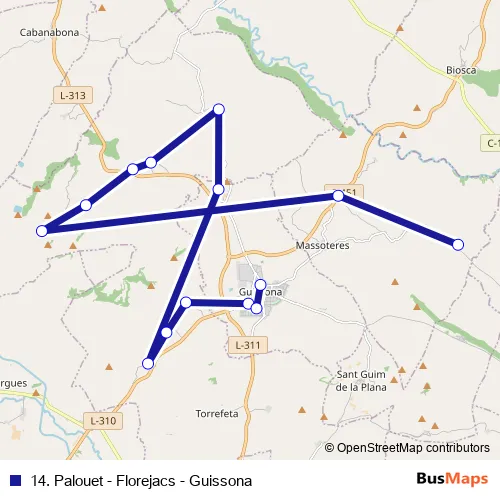 Guissona (Pl. Vell Pla). 14. Palouet - Florejacs - Guissona (14. Palouet - Florejacs - Guissona) is operational during entre semana.