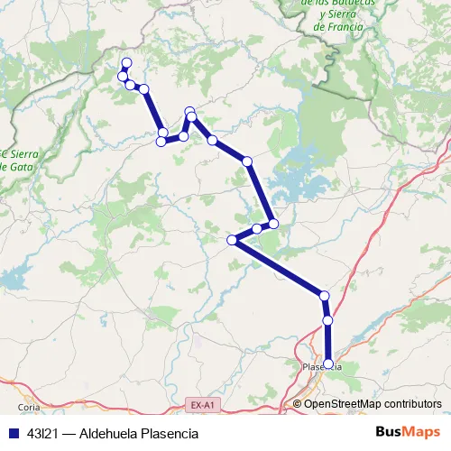 The first stop of the 43l21 bus route is Pinofranqueado and the last stop is Plasencia. 43l21 (Aldehuela Plasencia) is operational during entre semana.