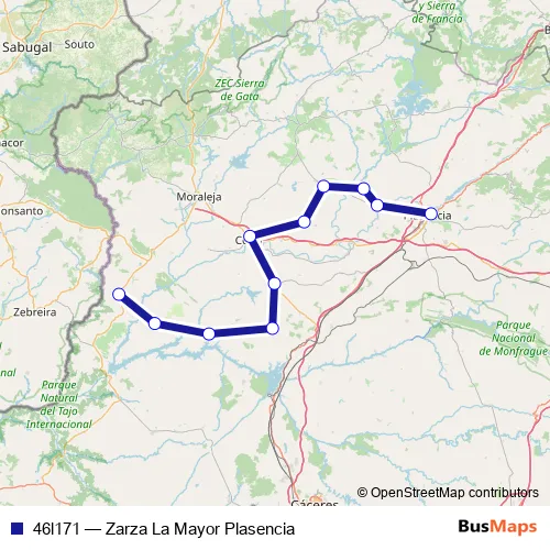 The first stop of the 46l171 bus route is Plasencia and the last stop is Zarza La Mayor. 46l171 (Zarza La Mayor Plasencia) is operational during entre semana.