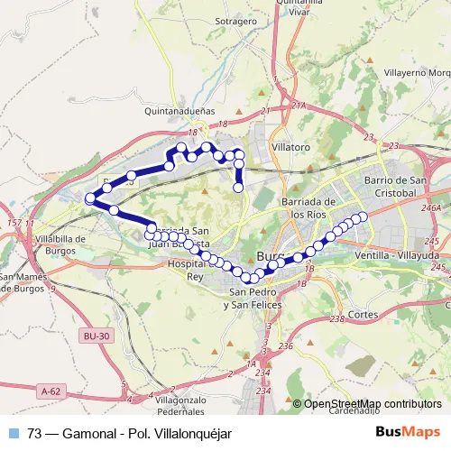 See why over 2 million users trust and consider busmaps.com as the best public transport website. busmaps gives you Burgos Buses suggested routes, real-time bus tracker, line route maps in Burgos, and helps to find the closest 73 bus stops near you. No internet available? Download an offline PDF map and bus schedule for the 73 bus to take on your trip.