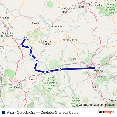 The first stop of the Alsa - Cordob-Gra bus route is Cabra and the last stop is Granada Estación de Autobuses. Alsa - Cordob-Gra (Cordoba-Granada Cabra) is operational during todos los días.
