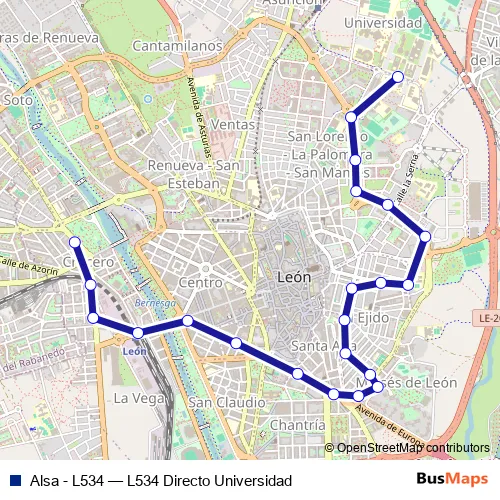 The first stop of the Alsa - L534 bus route is Av.Magdalena (Fte.P.Quevedo) and the last stop is Universidad Leon (Biblioteca). Alsa - L534 (L534 Directo Universidad) is operational during todos los días.