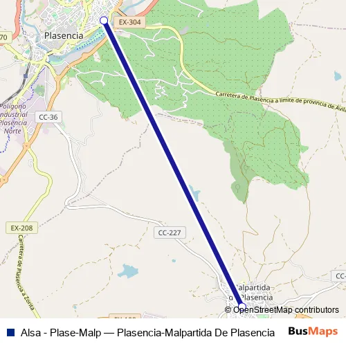The first stop of the Alsa - Plase-Malp bus route is Plasencia and the last stop is Malpartida De Plasencia. Alsa - Plase-Malp (Plasencia-Malpartida De Plasencia) is operational during entre semana.