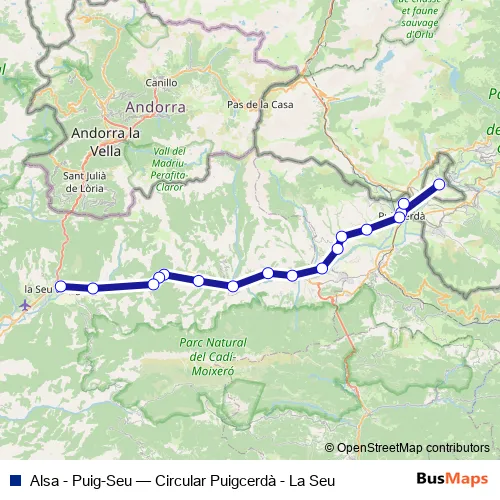 The first stop of the Alsa - Puig-Seu bus route is Llivia and the last stop is Seu D Urgell. Alsa - Puig-Seu (Circular Puigcerdà - La Seu) is operational during todos los días.