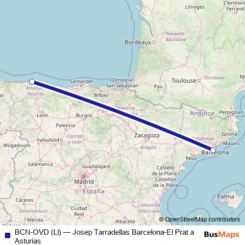 The first stop of the BCN-OVD (Ll) air route is Aeropuerto Josep Tarradellas Barcelona-El Prat and the last stop is Aeropuerto Asturias. BCN-OVD (Ll) (Josep Tarradellas Barcelona-El Prat a Asturias) is operational during todos los días.