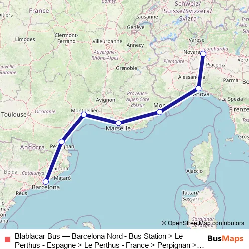 Blablacar Bus Blablacar Bus Barcelona Nord - Bus Station > Le Perthus - Espagne > Le Perthus - France > Perpignan > Montpellier > Marseille - St-Charles Bus station > Nice - Airport > Menton - France > Menton - Italie > Genoa - Via Fanti d'Italia > Milan Bus