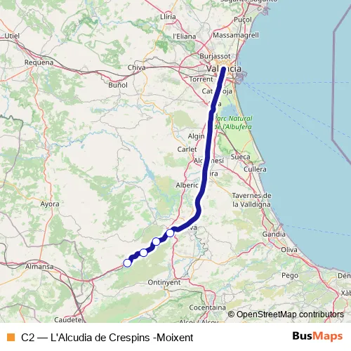 The first stop of the C2 bus route is L'alcúdia De Crespins and the last stop is Moixent. C2 (L'Alcudia de Crespins -Moixent) is operational during todos los días.