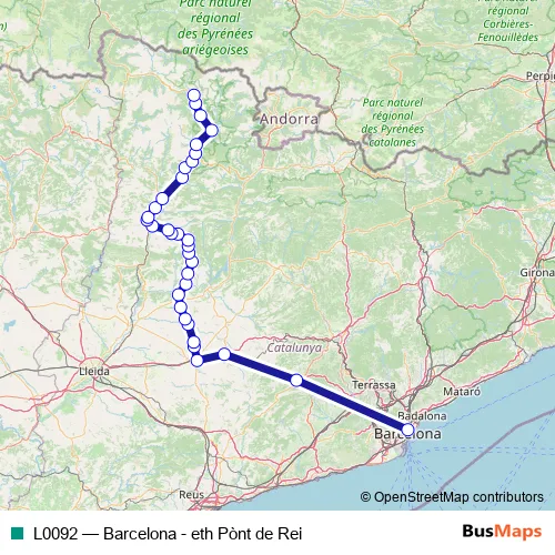 The first stop of the L0092 bus route is Barcelona Nord (estació d'autobusos) and the last stop is Esterri d'Àneu (c. Major, 93). L0092 (Barcelona - eth Pònt de Rei) is operational during todos los días.