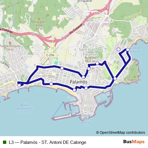 See why over 2 million users trust and consider busmaps.com as the best public transport website. busmaps gives you Palamos Buses suggested routes, real-time bus tracker, line route maps in Palamos, and helps to find the closest L3 bus stops near you. No internet available? Download an offline PDF map and bus schedule for the L3 bus to take on your trip.