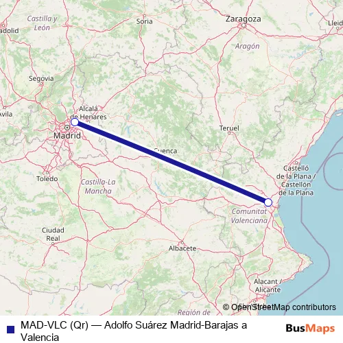 The first stop of the MAD-VLC (Qr) air route is Aeropuerto Adolfo Suárez Madrid-Barajas and the last stop is Aeropuerto Valencia. MAD-VLC (Qr) (Adolfo Suárez Madrid-Barajas a Valencia) is operational during todos los días.
