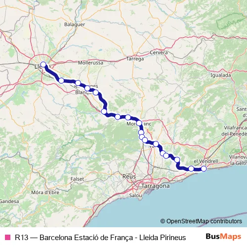 The first stop of the R13 rail route is Lleida Pirineus and the last stop is Sant Vicenç de Calders. R13 (Barcelona Estació de França - Lleida Pirineus) is operational during todos los días.