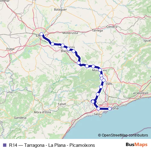The first stop of the R14 rail route is Lleida Pirineus and the last stop is Tarragona. R14 (Tarragona - La Plana - Picamoixons) is operational during todos los días.