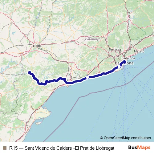 The first stop of the R15 bus route is Sant Vicenç De Calders and the last stop is