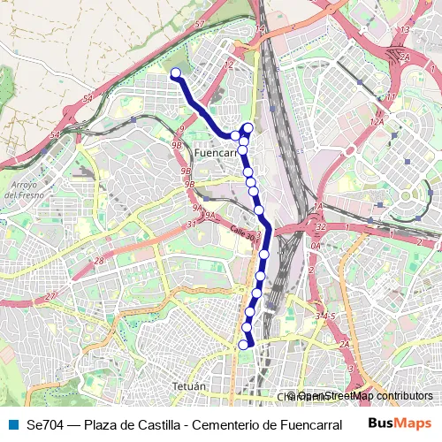 The first stop of the Se704 bus route is Cementerio De Fuencarral and the last stop is Plaza Castilla. Se704 (Plaza de Castilla - Cementerio de Fuencarral) is operational during los fines de semana.