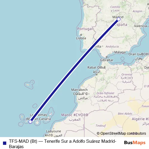 See why over 2 million users trust and consider busmaps.com as the best public transport website. busmaps gives you Madrid Flights suggested routes, real-time bus tracker, line route maps in Madrid, and helps to find the closest TFS-MAD (Bt) air stops near you. No internet available? Download an offline PDF map and bus schedule for the TFS-MAD (Bt) air to take on your trip.