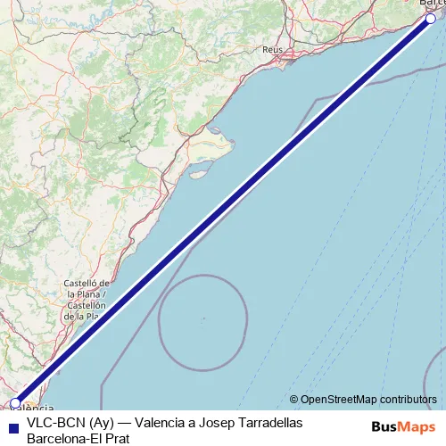 The first stop of the VLC-BCN (Ay) air route is Aeropuerto Valencia and the last stop is Aeropuerto Josep Tarradellas Barcelona-El Prat. VLC-BCN (Ay) (Valencia a Josep Tarradellas Barcelona-El Prat) is operational during entre semana.