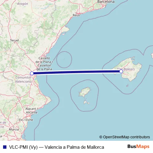 The first stop of the VLC-PMI (Vy) air route is Aeropuerto Valencia and the last stop is Aeropuerto Palma de Mallorca. VLC-PMI (Vy) (Valencia a Palma de Mallorca) is operational during todos los días.