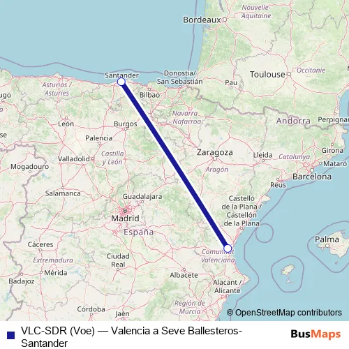 The first stop of the VLC-SDR (Voe) air route is Aeropuerto Valencia and the last stop is Aeropuerto Seve Ballesteros-Santander. VLC-SDR (Voe) (Valencia a Seve Ballesteros-Santander) is operational during todos los días.