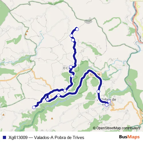 The first stop of the Xg613009 bus route is Valados and the last stop is A Pobra DE Trives. Xg613009 (Valados-A Pobra de Trives) is operational during entre semana.