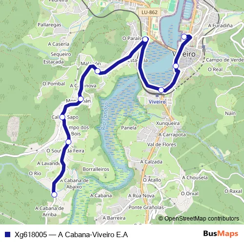 The first stop of the Xg618005 bus route is A Cabana and the last stop is Viveiro E.A.. Xg618005 (A Cabana-Viveiro E.A) is operational during todos los días.