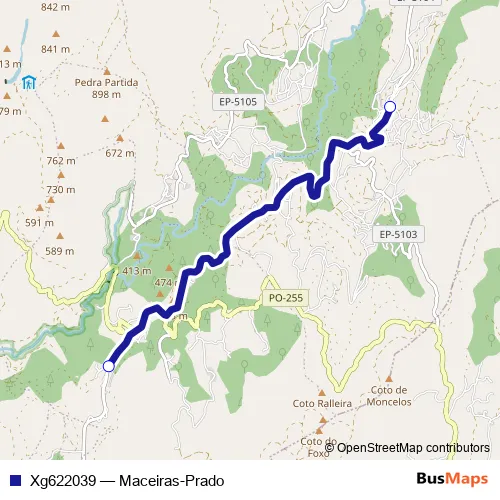 The first stop of the Xg622039 bus route is Prado and the last stop is Maceiras. Xg622039 (Maceiras-Prado) is operational during entre semana.