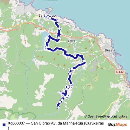 The first stop of the Xg633007 bus route is SAN Cibrao AV. DA Mariña and the last stop is RUA (Curuxeiras). Xg633007 (San Cibrao Av. da Mariña-Rua (Curuxeiras)) is operational during entre semana.