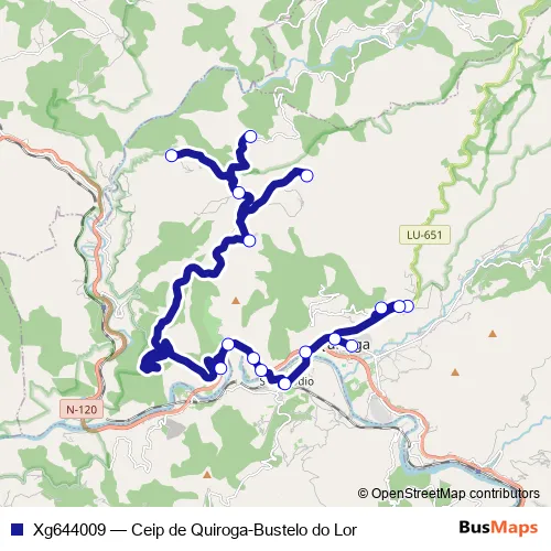 The first stop of the Xg644009 bus route is Bustelo DO Lor and the last stop is Ceip de Quiroga. Xg644009 (Ceip de Quiroga-Bustelo do Lor) is operational during entre semana.