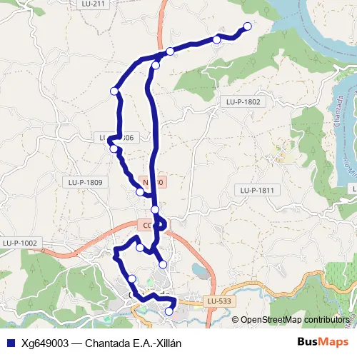 The first stop of the Xg649003 bus route is Xillán and the last stop is Chantada E.A.. Xg649003 (Chantada E.A.-Xillán) is operational during entre semana.