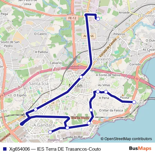 The first stop of the Xg654006 bus route is IES Terra DE Trasancos and the last stop is Urb. O Couto. Xg654006 (IES Terra DE Trasancos-Couto) is operational during entre semana.
