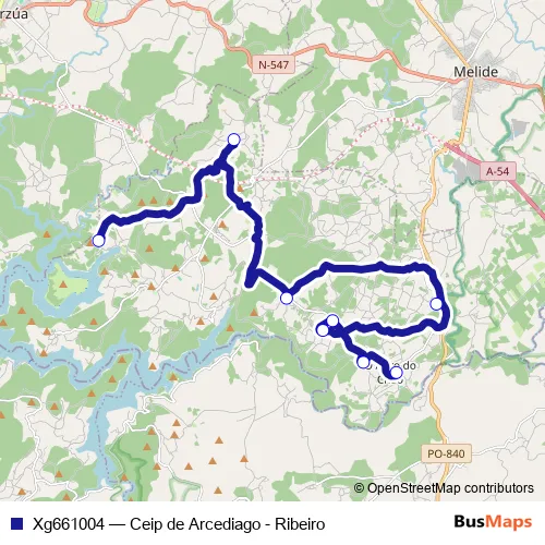 The first stop of the Xg661004 bus route is Ribeiro and the last stop is Ceip de Arcediago. Xg661004 (Ceip de Arcediago - Ribeiro) is operational during entre semana.
