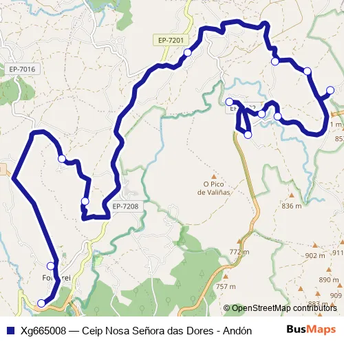 The first stop of the Xg665008 bus route is Ceip Nosa Señora das Dores and the last stop is Andón. Xg665008 (Ceip Nosa Señora das Dores - Andón) is operational during entre semana.